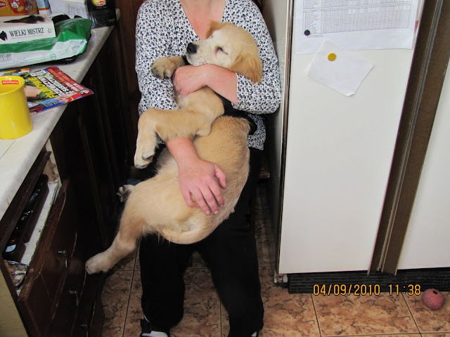 Tosia 40 nie waży co prawda, ale na kolana pakuje się regularnie i to jest fajne, taki ciut większy yorczek, przytulanek Wie to ktoś w jakim wieku goldeny poważnieją